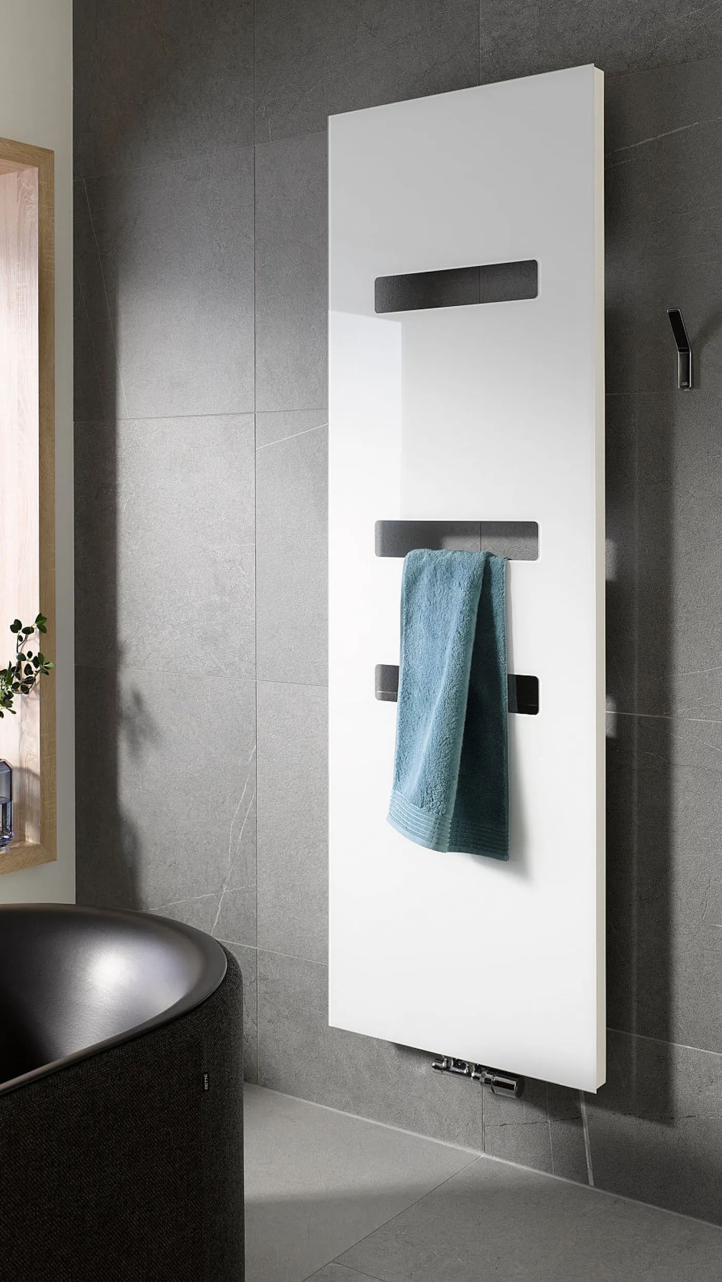 Ein besonderes Detail: Der Linie Plus verfügt über vereinzelt vorstehende Heizsprossen, auf die sich Handtücher zum Vorwärmen seitlich aufschieben lassen. Dadurch wird der Heizkörper nicht verdeckt und kann bei gleicher Heizleistung Badezimmer und Handtücher aufwärmen.